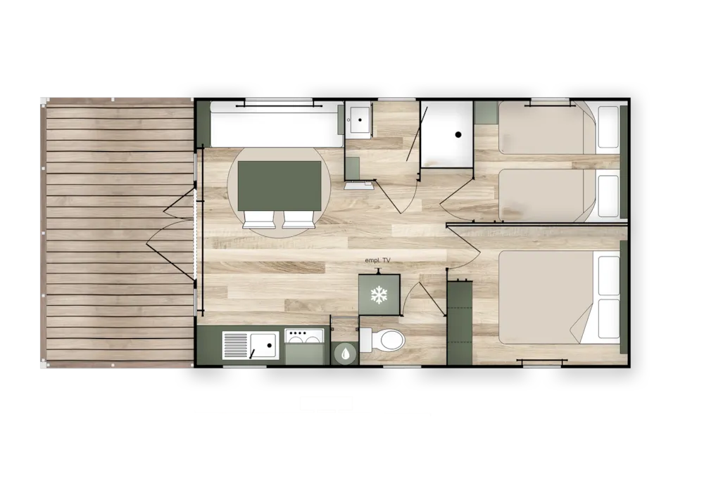 Plaatstype : COTTAGE Premium 29m² 2 slaapkamers + TV + Vaatwasser + airconditioning + plancha + XL terras